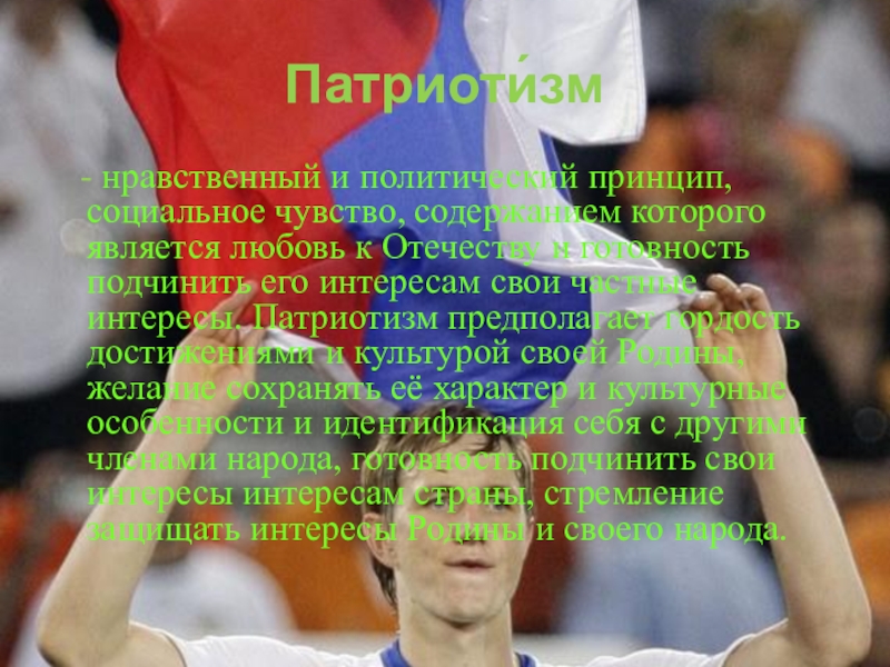 является любовь к Отечеству и готовность подчинить его интересам свои частные интересы. Патриотизм предполагает гордость достижениями и культурой своей Родины, желание сохранять её характер и культурные особенности и идентификация себя с другими членами народа, готовность подчинить свои интересы интересам страны, стремление защищать интересы Родины и своего народа.