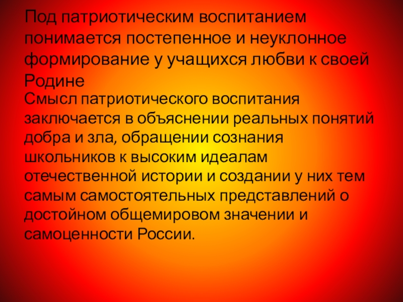 Под патриотическим воспитанием понимается постепенное и неуклонное формирование у учащихся любви