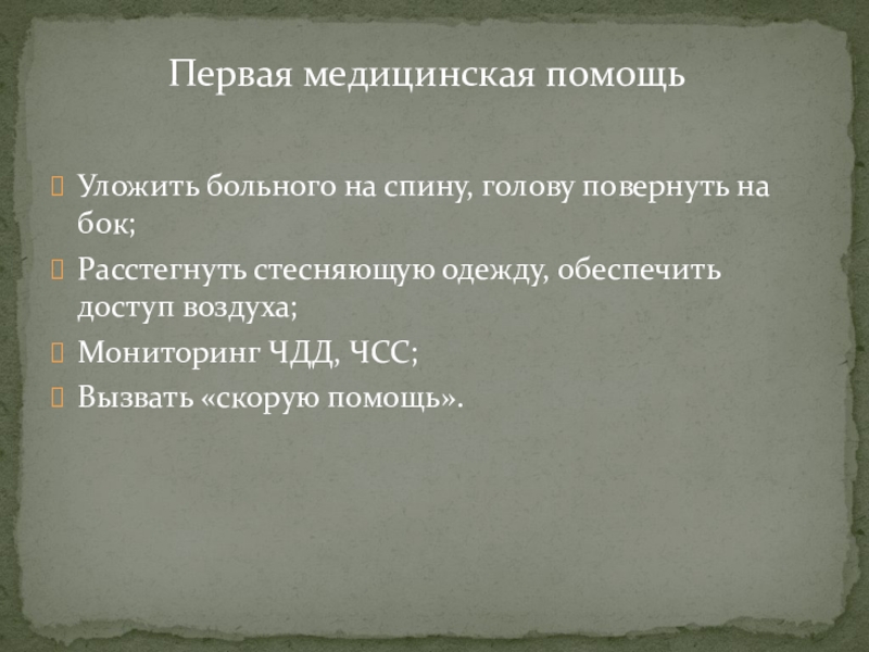 Слайд 22Уложить больного на спину, голову повернуть на бок;