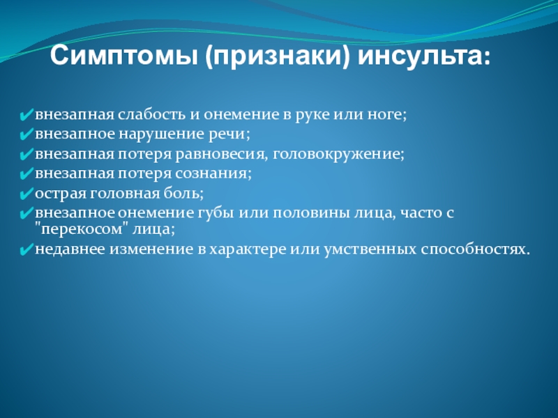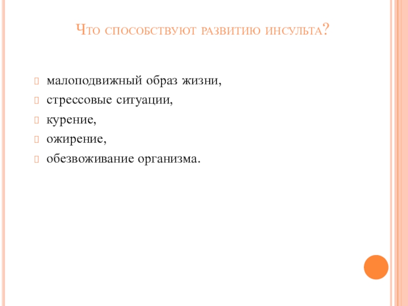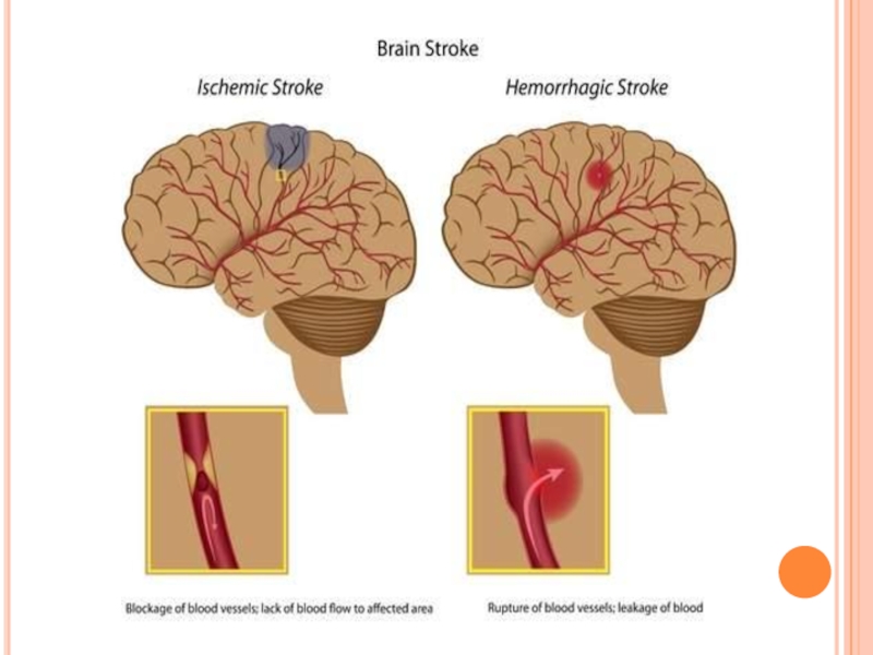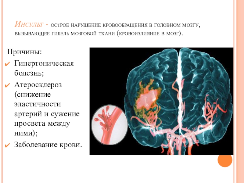 Слайд 23Инсульт - острое нарушение кровообращения в головном мозгу, вызывающее гибель мозговой