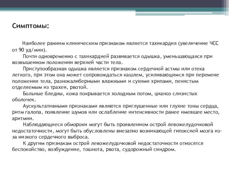К другим признакам острой левожелудочковой недостаточности относятся беспокойство, возбуждение, тошнота, рвота, судорожный синдром.