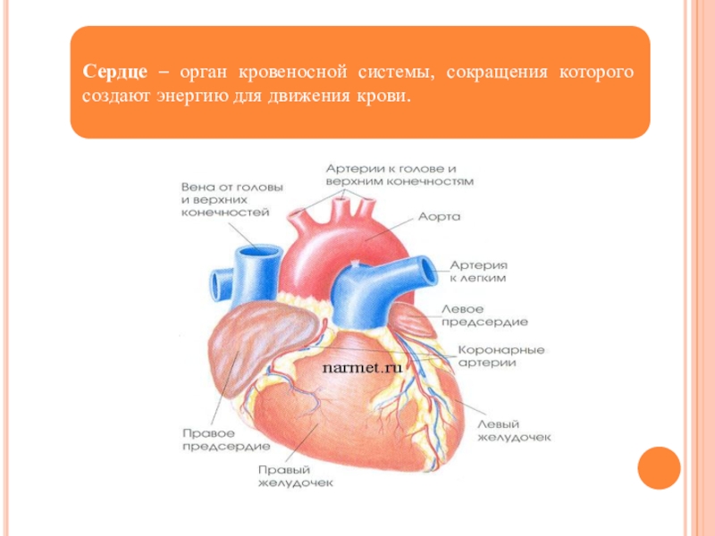 Слайд 6Сердце – орган кровеносной системы, сокращения которого создают энергию для движения