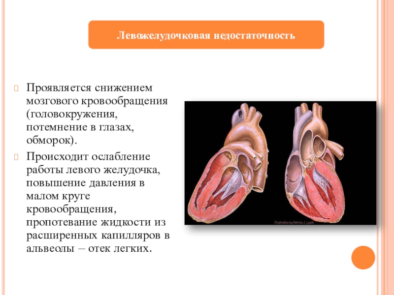 левого желудочка, повышение давления в малом круге кровообращения, пропотевание жидкости из расширенных капилляров в альвеолы – отек легких.