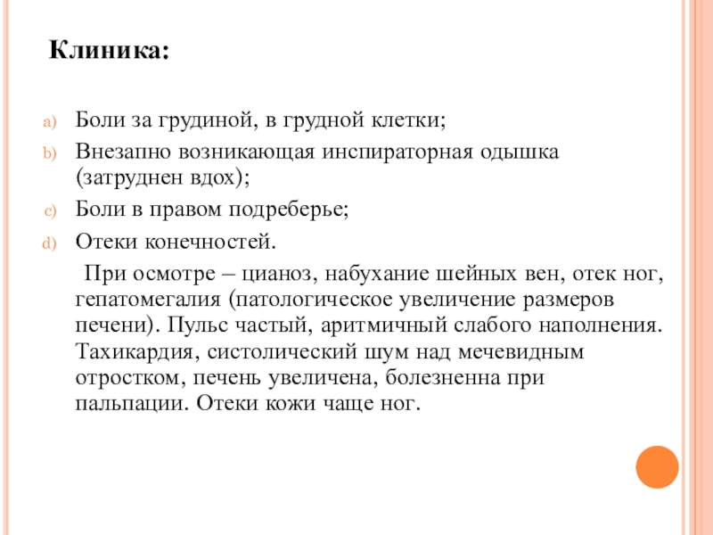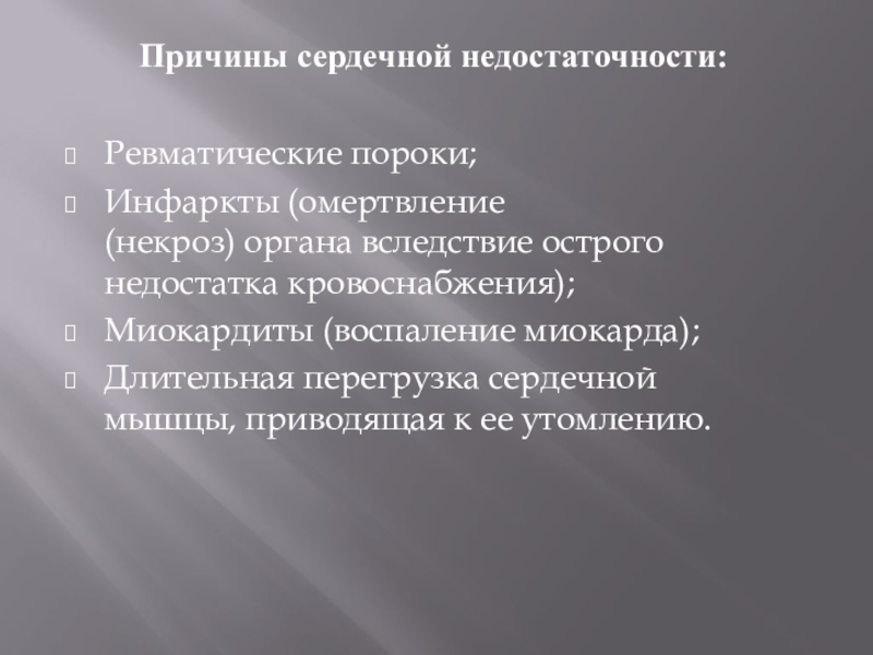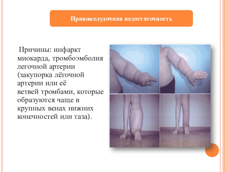 Слайд 20 Причины: инфаркт миокарда, тромбоэмболия легочной артерии (закупорка лёгочной артерии или её