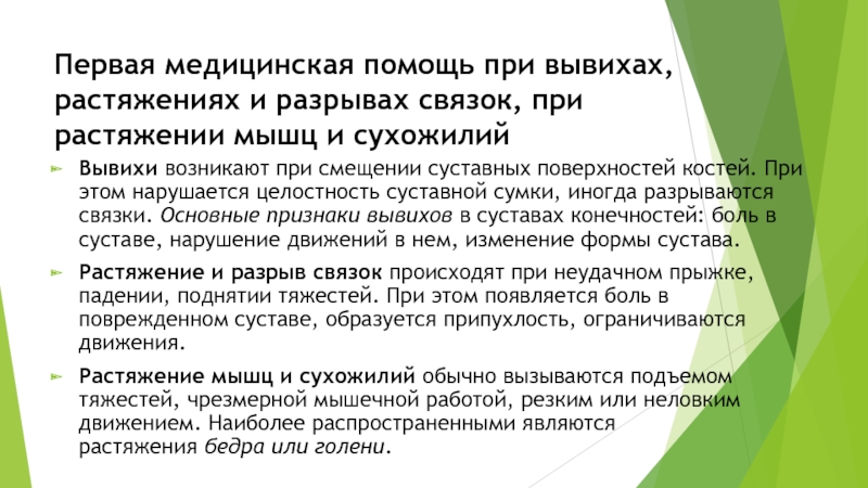 Растяжение и разрыв связок происходят при неудачном прыжке, падении, поднятии тяжестей. При этом появляется боль в поврежденном суставе, образуется припухлость, ограничиваются движения.