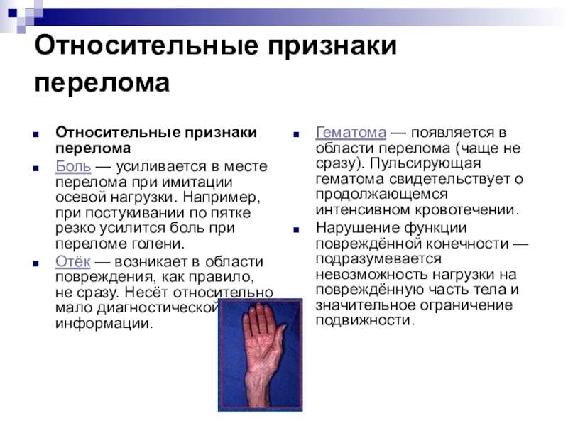 Гематома — появляется в области перелома (чаще не сразу). Пульсирующая гематома свидетельствует о продолжающемся интенсивном кровотечении.
