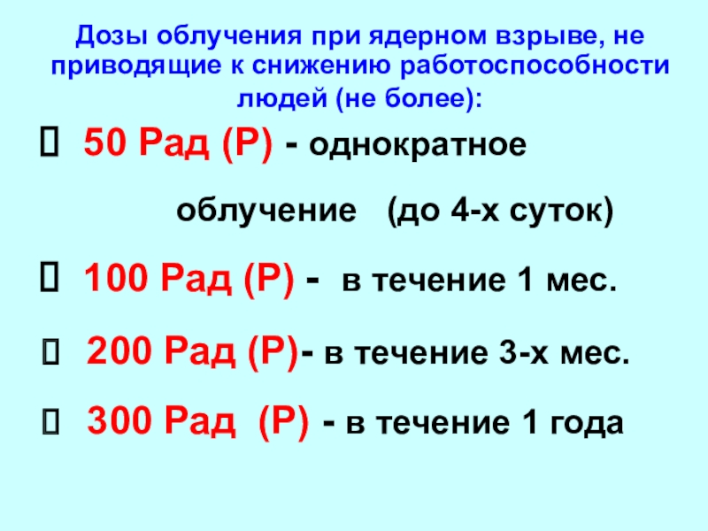 Дозы облучения при ядерном взрыве, не приводящие к снижению работоспособности людей (не более):