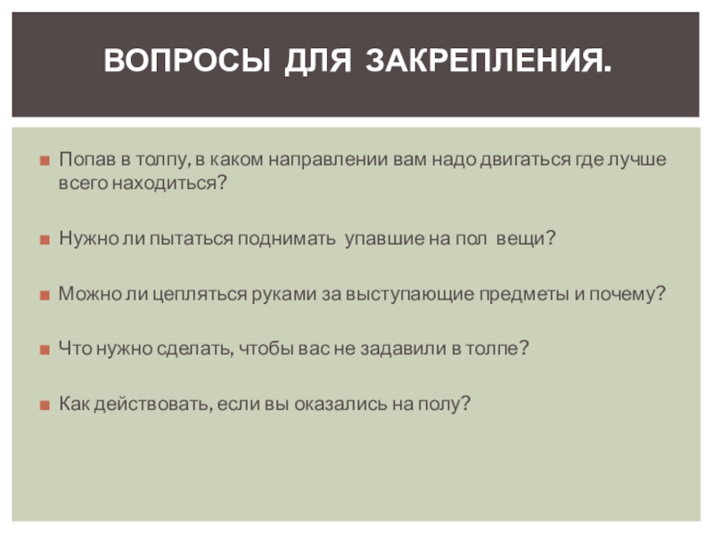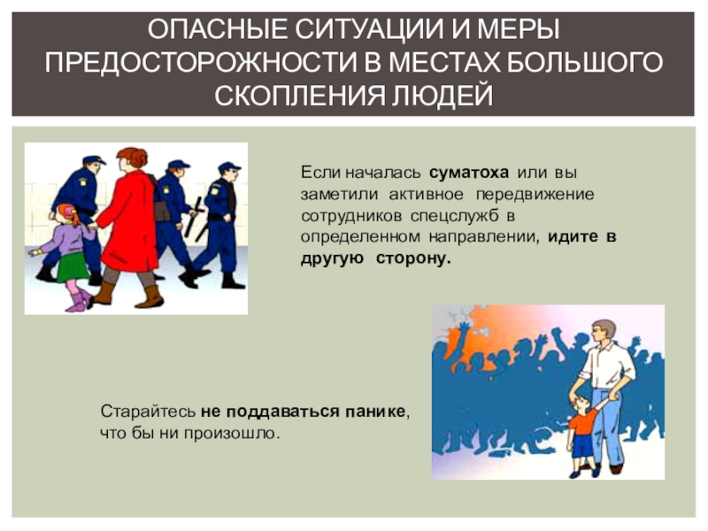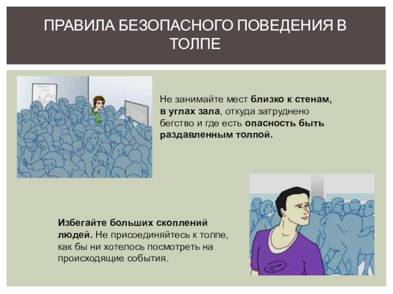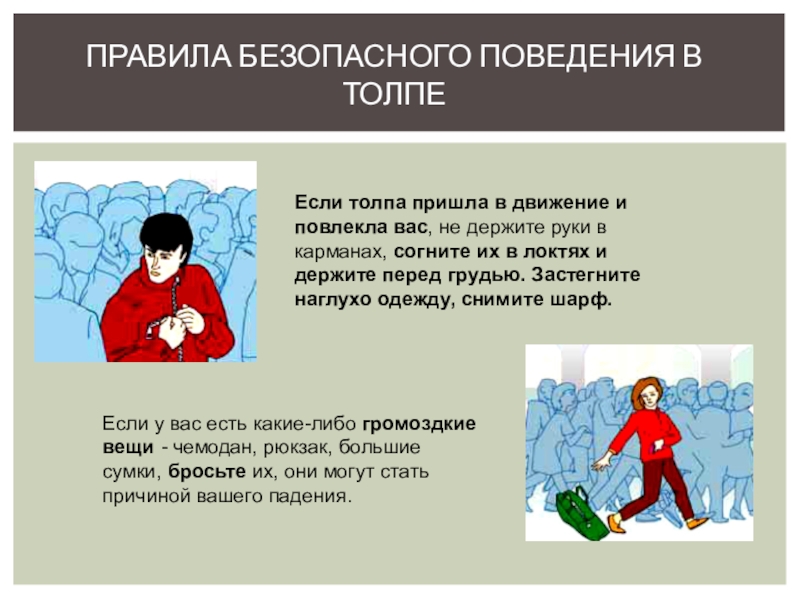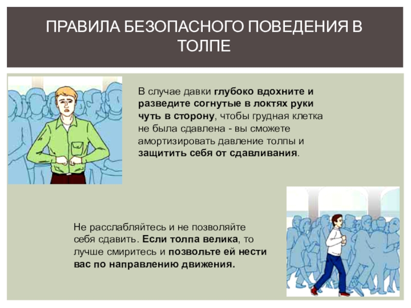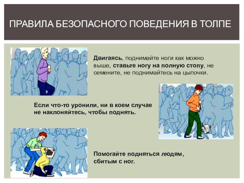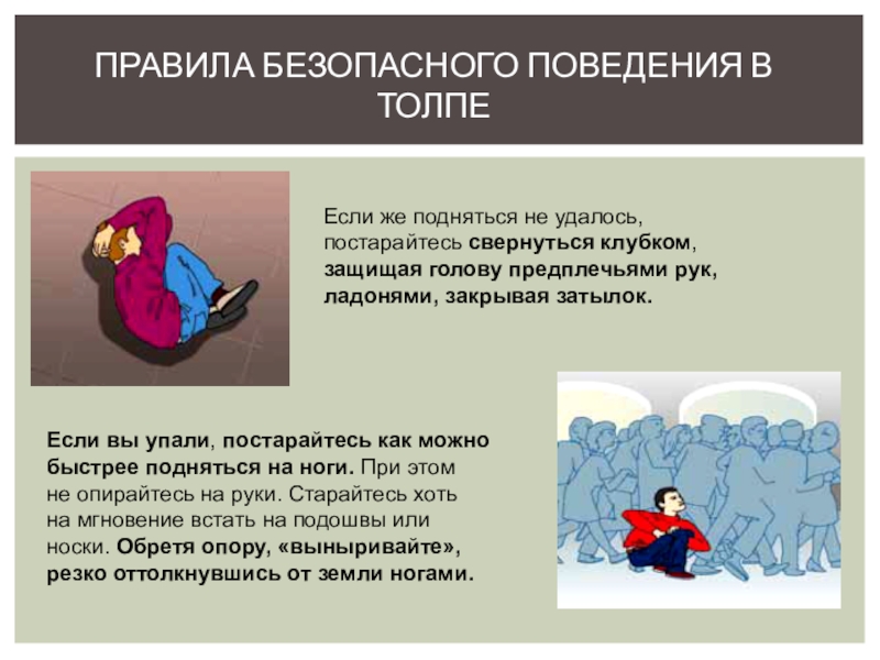 Остерегайтесь быть в центре и с края толпы. Любыми способами старайтесь удержаться на ногах.