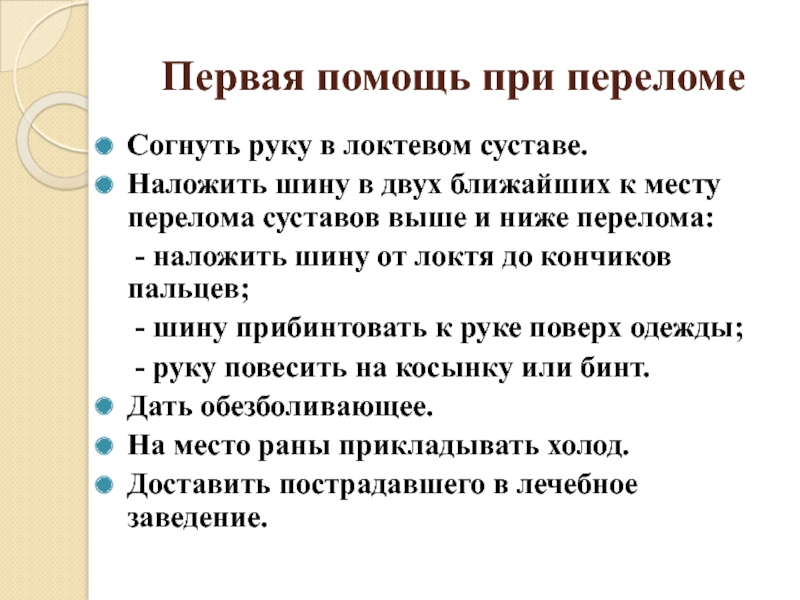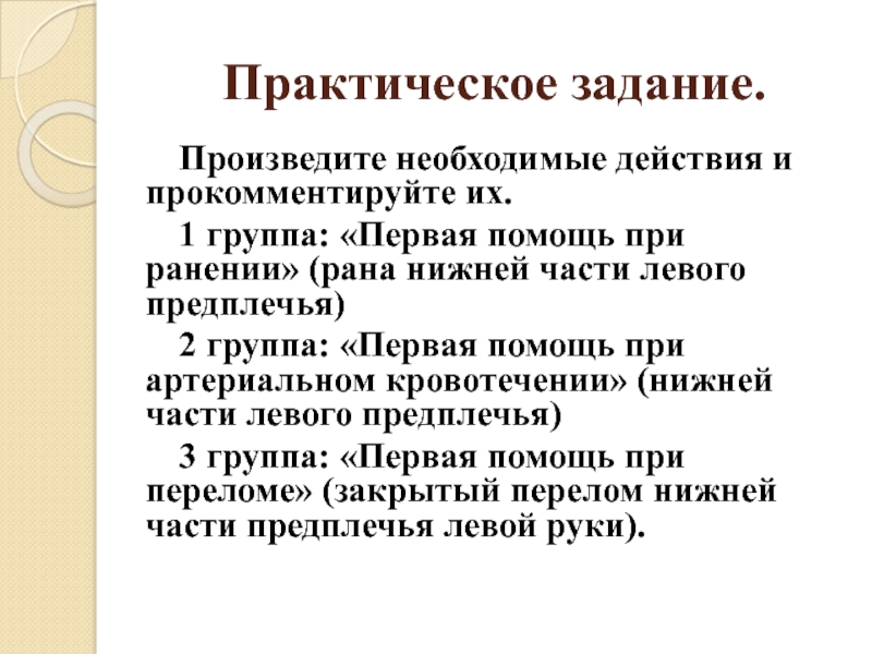 3 группа: «Первая помощь при переломе» (закрытый перелом нижней части предплечья левой руки).