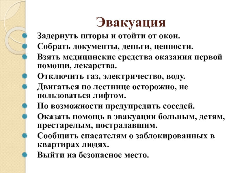 Оказать помощь в эвакуации больным, детям, престарелым, пострадавшим.