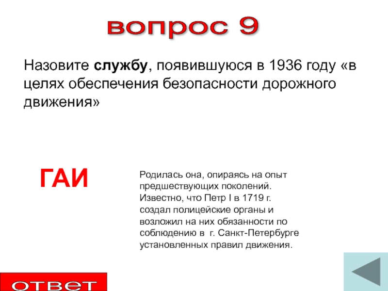 Родилась она, опираясь на опыт предшествующих поколений. Известно, что Петр I в 1719 г. создал полицейские органы и возложил на них обязанности по соблюдению в г. Санкт-Петербурге установленных правил движения.