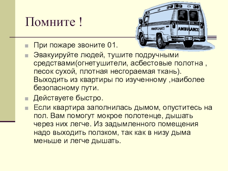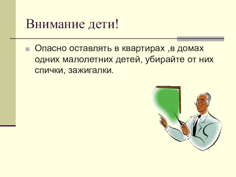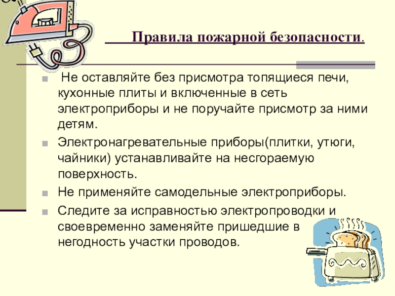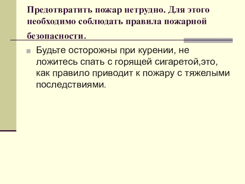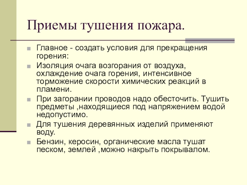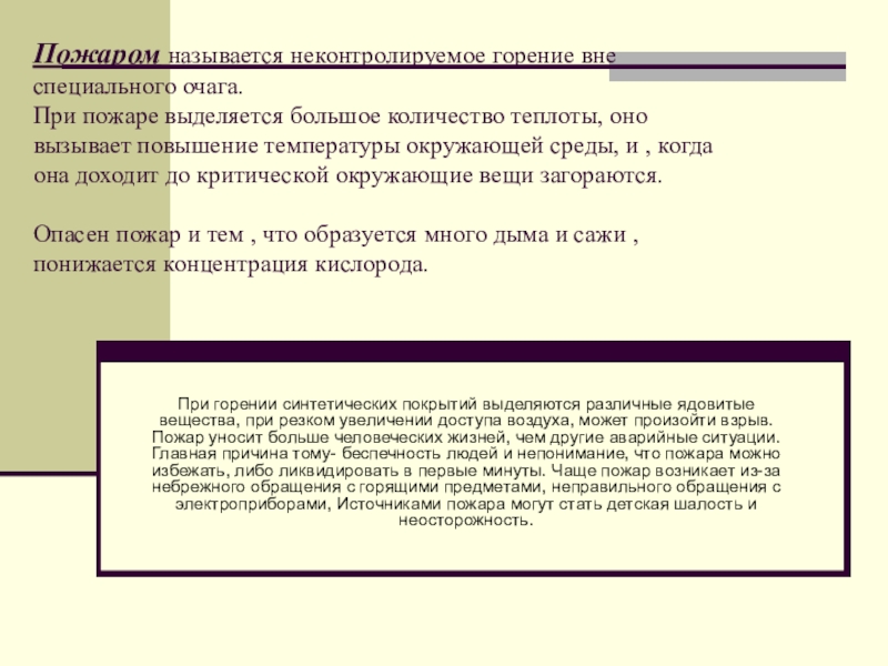 При горении синтетических покрытий выделяются различные ядовитые вещества, при резком увеличении доступа воздуха, может произойти взрыв. Пожар уносит больше человеческих жизней, чем другие аварийные ситуации. Главная причина тому- беспечность людей и непонимание, что пожара можно избежать, либо ликвидировать в первые минуты. Чаще пожар возникает из-за небрежного обращения с горящими предметами, неправильного обращения с электроприборами, Источниками пожара могут стать детская шалость и неосторожность.
