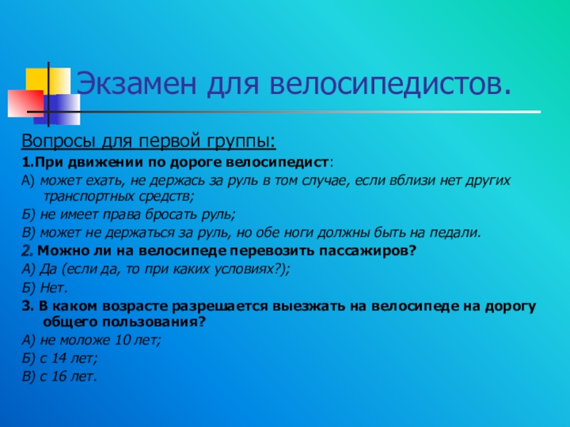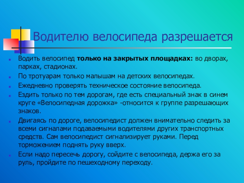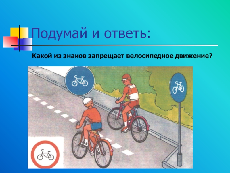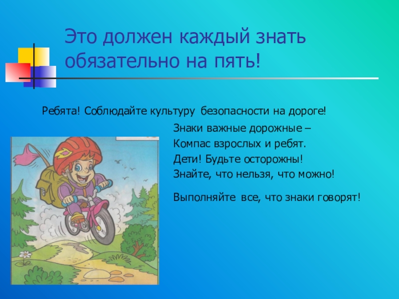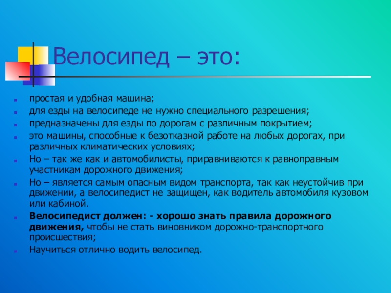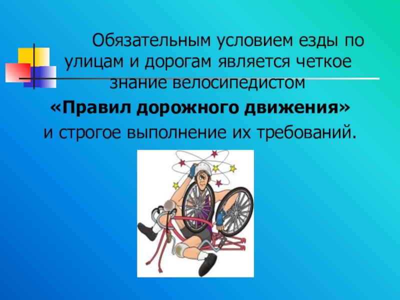 Велосипедист должен: - хорошо знать правила дорожного движения, чтобы не стать виновником дорожно-транспортного происшествия;