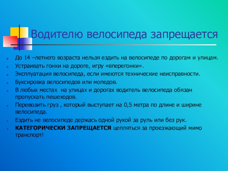 До 14 –летнего возраста нельзя ездить на велосипеде по