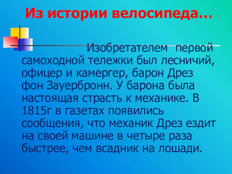 Изобретателем первой самоходной тележки был лесничий, офицер и камергер, барон Дрез фон Зауербронн. У барона была настоящая страсть к механике. В 1815г в газетах появились сообщения, что механик Дрез ездит на своей машине в четыре раза быстрее, чем всадник на лошади.