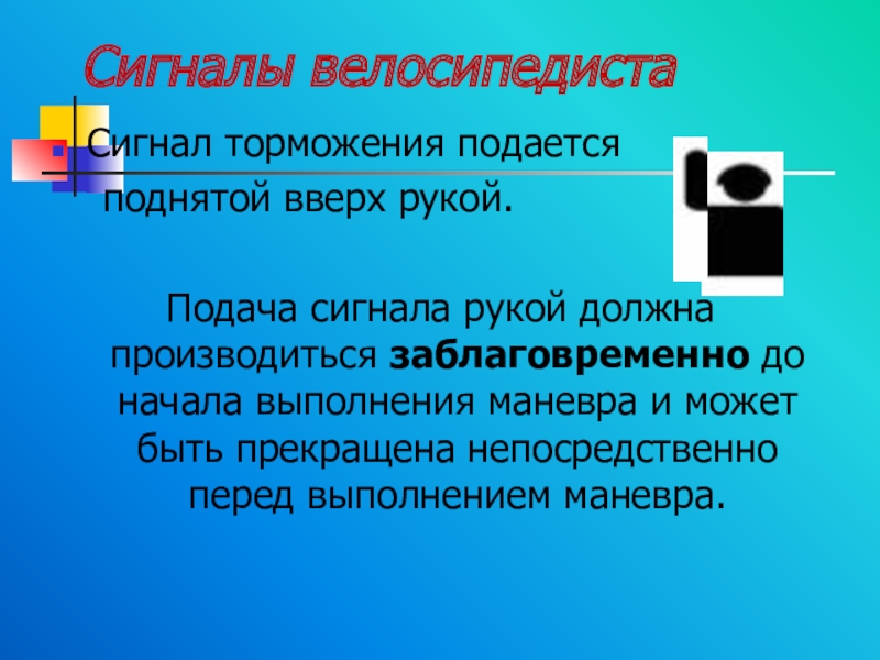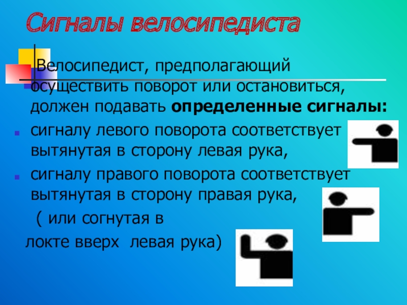 Велосипедист, предполагающий осуществить поворот или остановиться, должен подавать