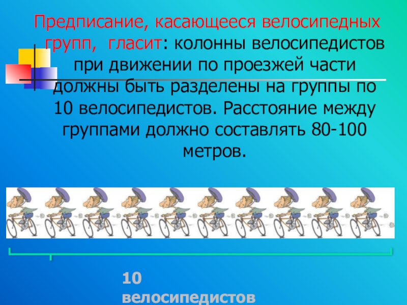 Слайд 24Предписание, касающееся велосипедных групп, гласит: колонны велосипедистов при движении по проезжей