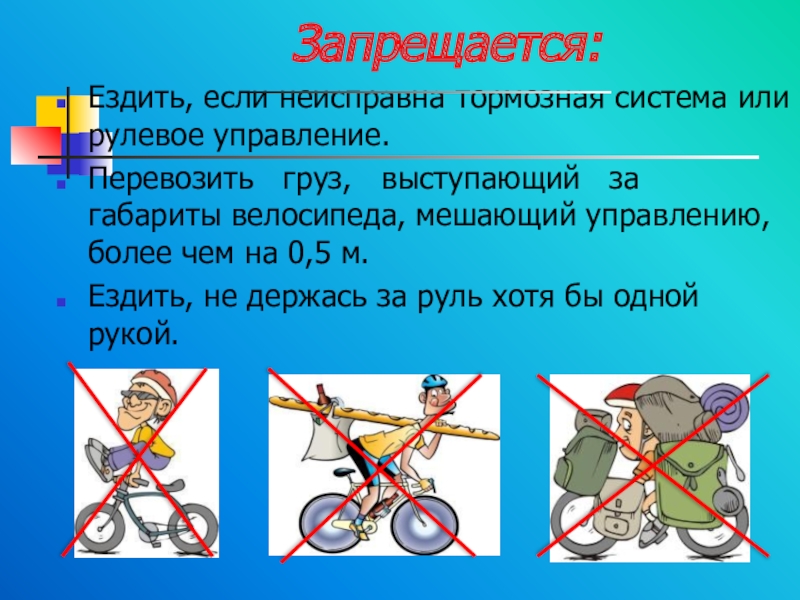 Перевозить груз, выступающий за габариты велосипеда, мешающий управлению, более чем на 0,5 м.