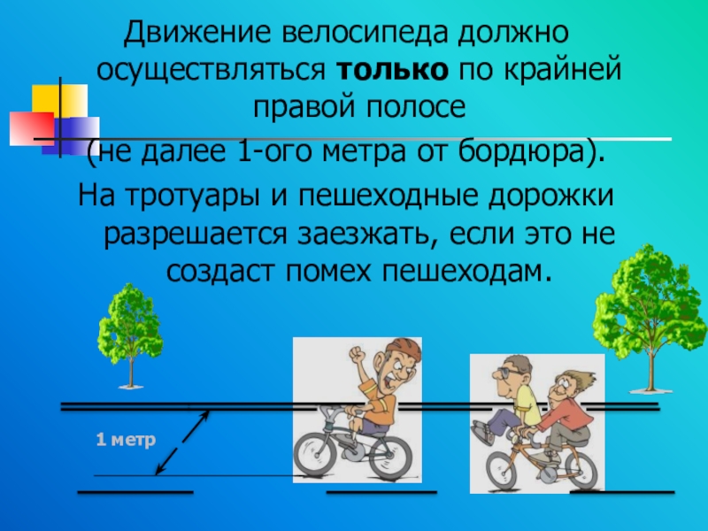 Слайд 18Движение велосипеда должно осуществляться только по крайней правой полосе