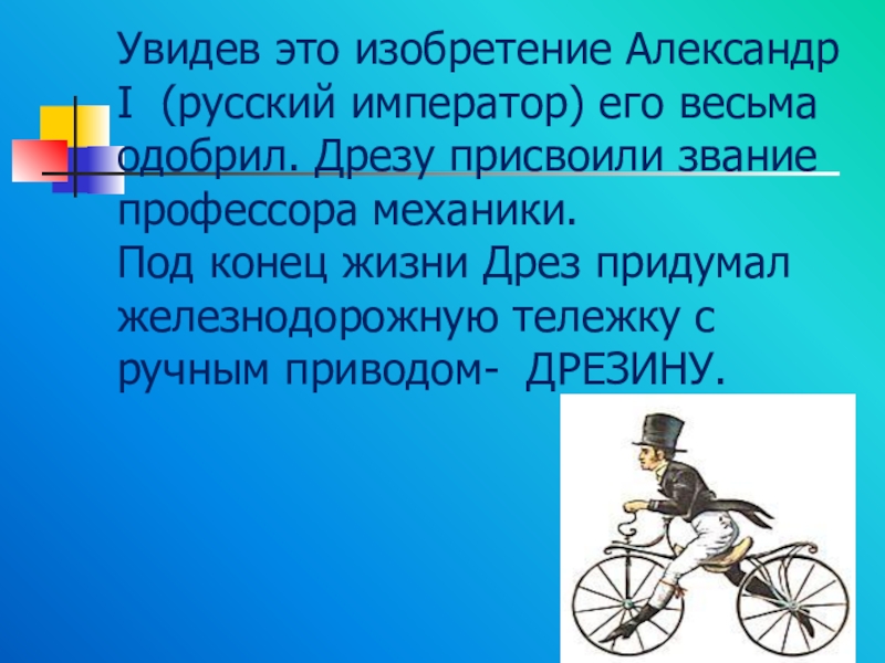 Слайд 5Увидев это изобретение Александр I (русский император) его весьма одобрил. Дрезу