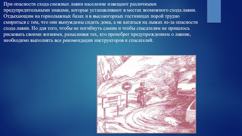 Слайд 7При опасности схода снежных лавин население извещают различными предупредительными знаками, которые