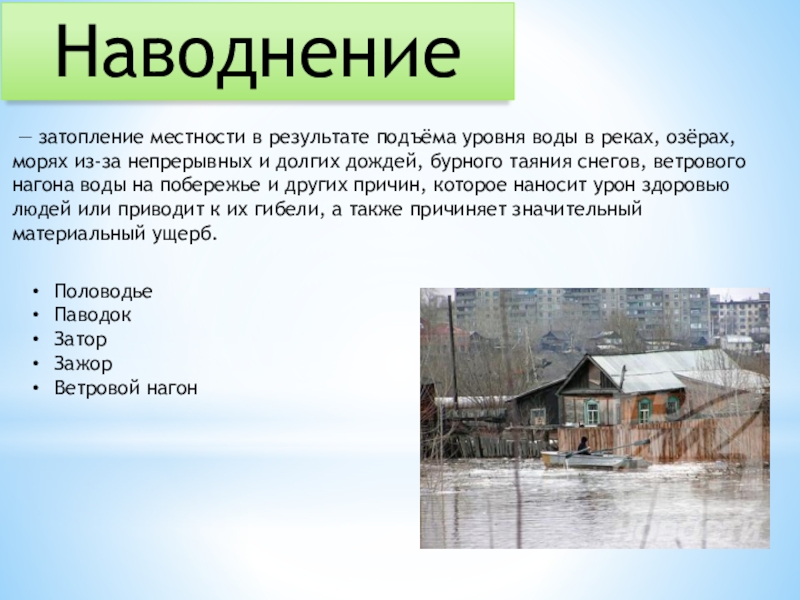 морях из-за непрерывных и долгих дождей, бурного таяния снегов, ветрового нагона воды на побережье и других причин, которое наносит урон здоровью людей или приводит к их гибели, а также причиняет значительный материальный ущерб.