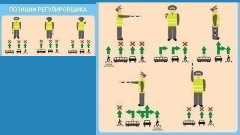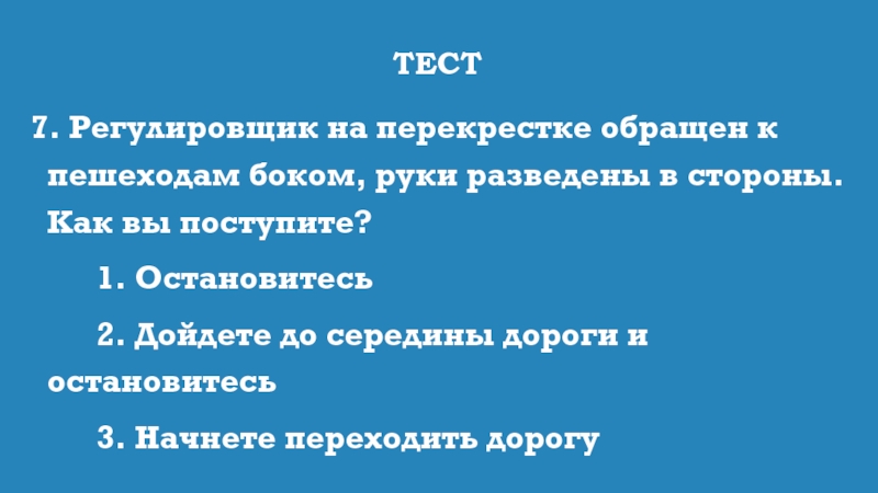 7. Регулировщик на перекрестке обращен к пешеходам боком, руки разведены в
