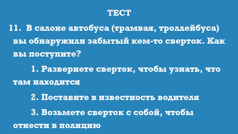 11. В салоне автобуса (трамвая, троллейбуса) вы обнаружили забытый кем-то сверток.