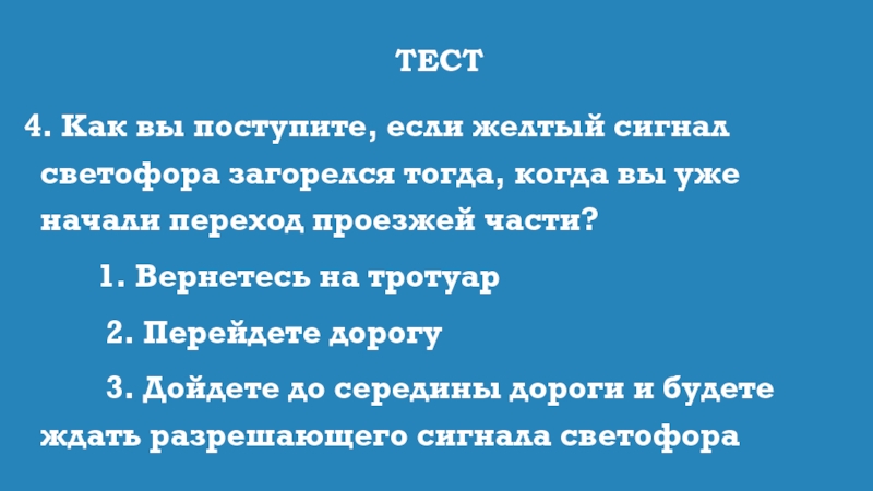 4. Как вы поступите, если желтый сигнал светофора загорелся тогда, когда