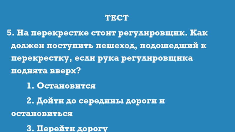 5. На перекрестке стоит регулировщик. Как должен поступить пешеход, подошедший к