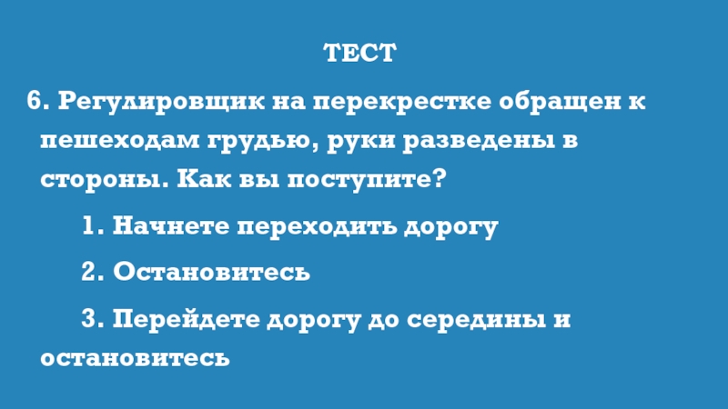 6. Регулировщик на перекрестке обращен к пешеходам грудью, руки разведены в