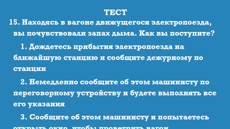 15. Находясь в вагоне движущегося электропоезда, вы почувствовали запах дыма. Как