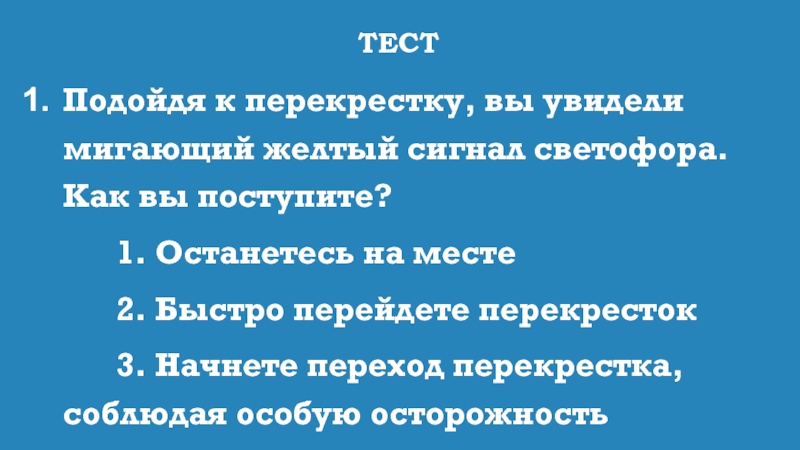 1. Остановится, посмотреть в ту сторону дороги, откуда движутся машины, и, если поблизости нет машин, начать переход дороги
