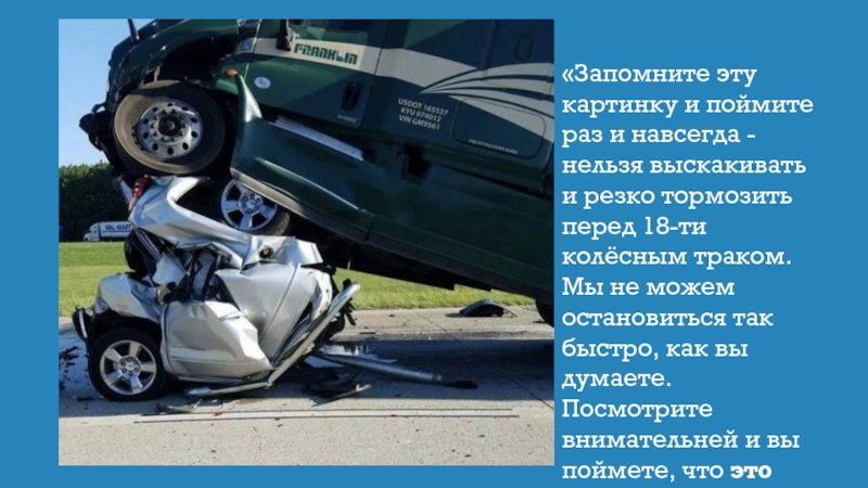 и резко тормозить перед 18-ти колёсным траком. Мы не можем остановиться так быстро, как вы думаете. Посмотрите внимательней и вы поймете, что это был 4-х дверный Шевроле пикап.»