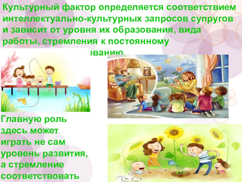 Культурный фактор определяется соответствием интеллектуально-культурных запросов супругов и зависит от уровня их образования, вида работы, стремления к постоянному самосовершенствованию.