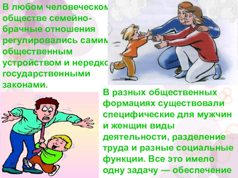 В разных общественных формациях существовали специфические для мужчин и женщин виды деятельности, разделение труда и разные социальные функции. Все это имело одну задачу — обеспечение смены поколений.