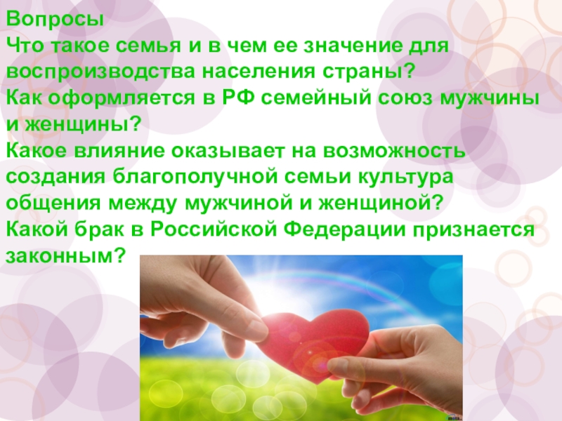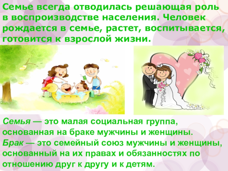 Семье всегда отводилась решающая роль в воспроизводстве населения. Человек рождается в семье, растет, воспитывается, готовится к взрослой жизни.