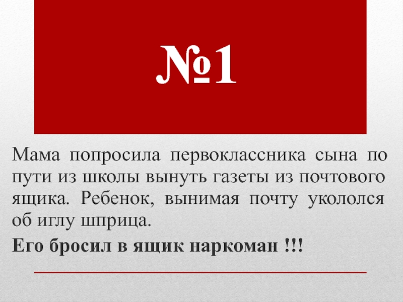 почтового ящика. Ребенок, вынимая почту укололся об иглу шприца.