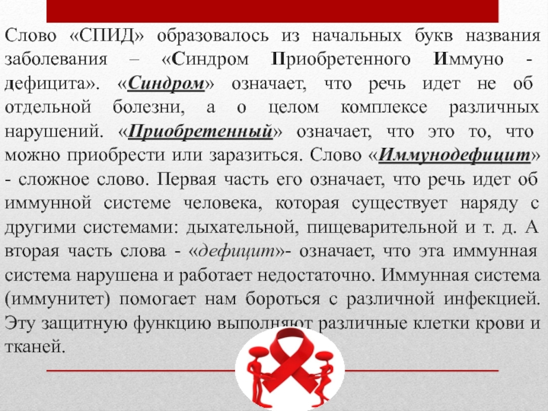 Иммуно - дефицита». «Синдром» означает, что речь идет не об отдельной болезни, а о целом комплексе различных нарушений. «Приобретенный» означает, что это то, что можно приобрести или заразиться. Слово «Иммунодефицит» - сложное слово. Первая часть его означает, что речь идет об иммунной системе человека, которая существует наряду с другими системами: дыхательной, пищеварительной и т. д. А вторая часть слова - «дефицит»- означает, что эта иммунная система нарушена и работает недостаточно. Иммунная система (иммунитет) помогает нам бороться с различной инфекцией. Эту защитную функцию выполняют различные клетки крови и тканей.
