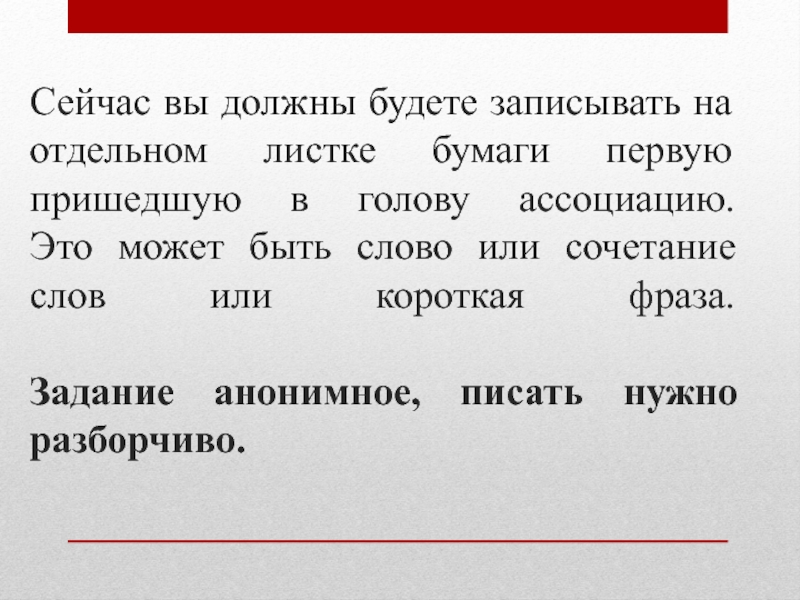 Слайд 3Сейчас вы должны будете записывать на отдельном листке бумаги первую пришедшую