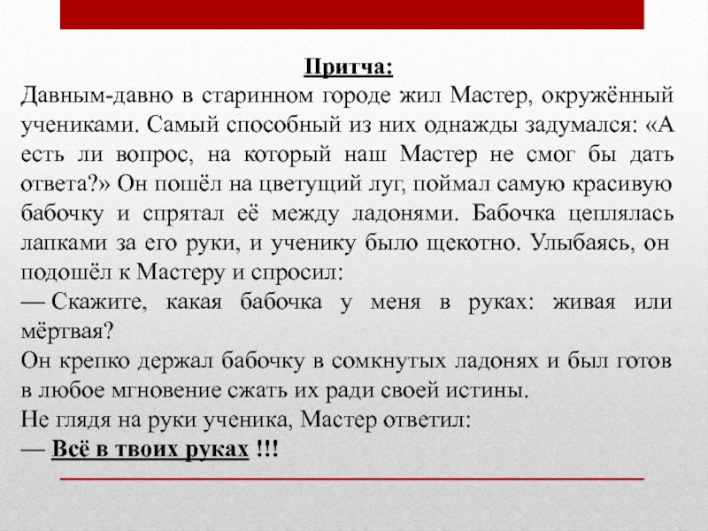 них однажды задумался: «А есть ли вопрос, на который наш Мастер не смог бы дать ответа?» Он пошёл на цветущий луг, поймал самую красивую бабочку и спрятал её между ладонями. Бабочка цеплялась лапками за его руки, и ученику было щекотно. Улыбаясь, он подошёл к Мастеру и спросил: