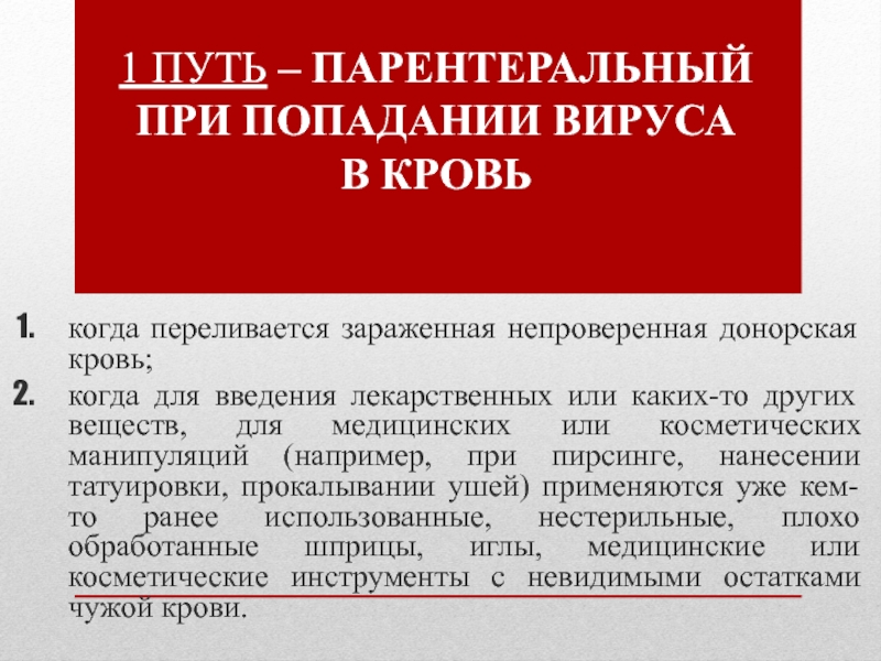 когда для введения лекарственных или каких-то других веществ, для медицинских или косметических манипуляций (например, при пирсинге, нанесении татуировки, прокалывании ушей) применяются уже кем-то ранее использованные, нестерильные, плохо обработанные шприцы, иглы, медицинские или косметические инструменты с невидимыми остатками чужой крови.