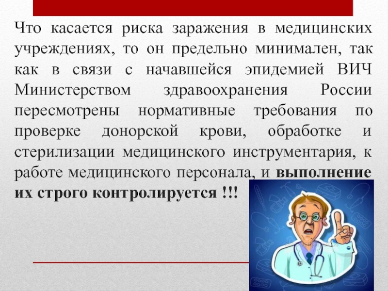 Слайд 11Что касается риска заражения в медицинских учреждениях, то он предельно минимален,