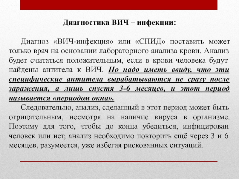на основании лабораторного анализа крови. Анализ будет считаться положительным, если в крови человека будут найдены антитела к ВИЧ. Но надо иметь ввиду, что эти специфические антитела вырабатываются не сразу после заражения, а лишь спустя 3-6 месяцев, и этот период называется «периодом окна».