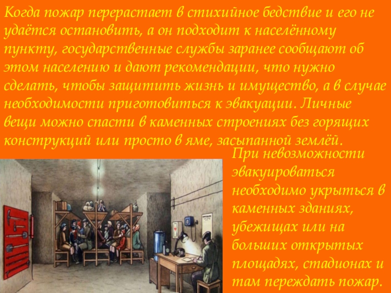 При невозможности эвакуироваться необходимо укрыться в каменных зданиях, убежищах или на больших открытых площадях, стадионах и там переждать пожар.