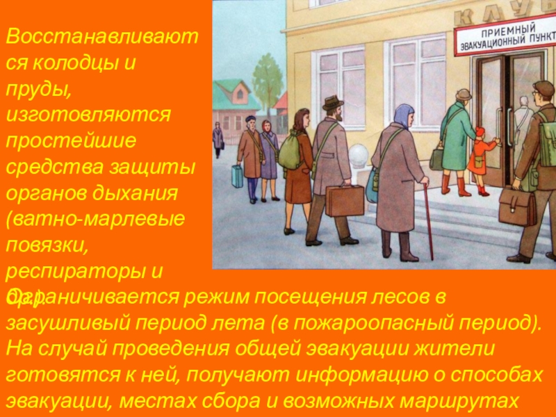 Ограничивается режим посещения лесов в засушливый период лета (в пожароопасный период).На случай проведения общей эвакуации жители готовятся к ней, получают информацию о способах эвакуации, местах сбора и возможных маршрутах движения.