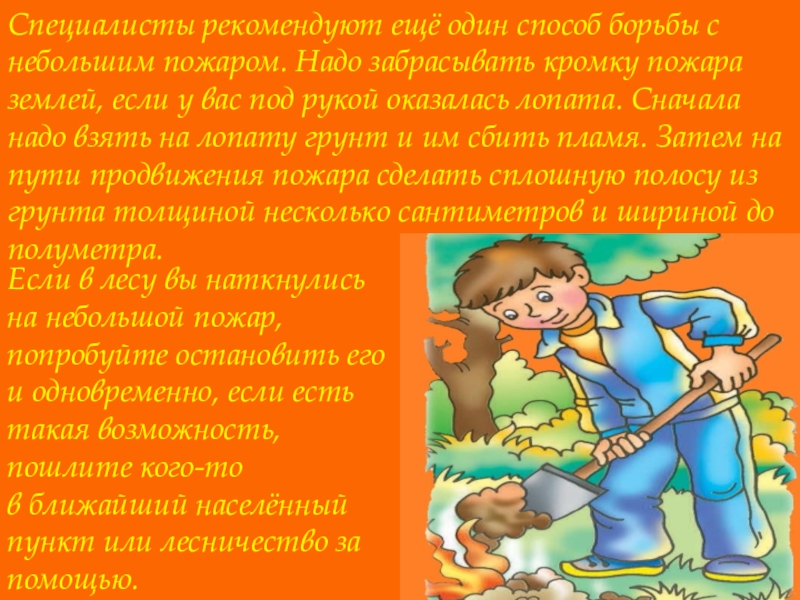 Если в лесу вы наткнулись на небольшой пожар, попробуйте остановить его и одновременно, если есть такая возможность, пошлите кого-то