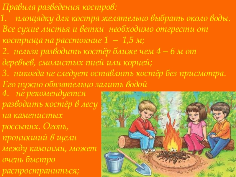 4. не рекомендуется разводить костёр в лесу на каменистых россыпях. Огонь, проникший в щели между камнями, может очень быстро распространиться;