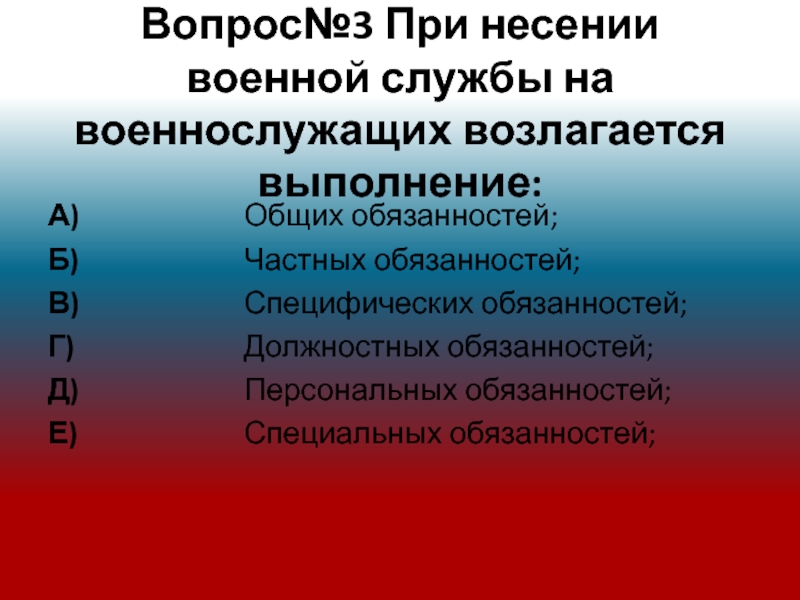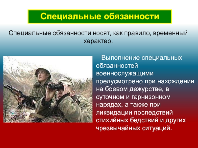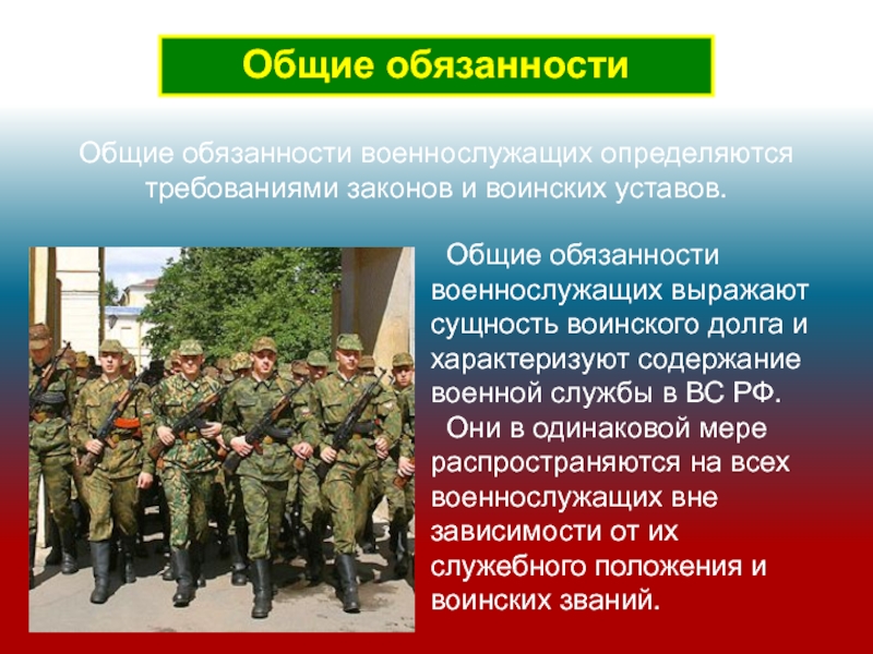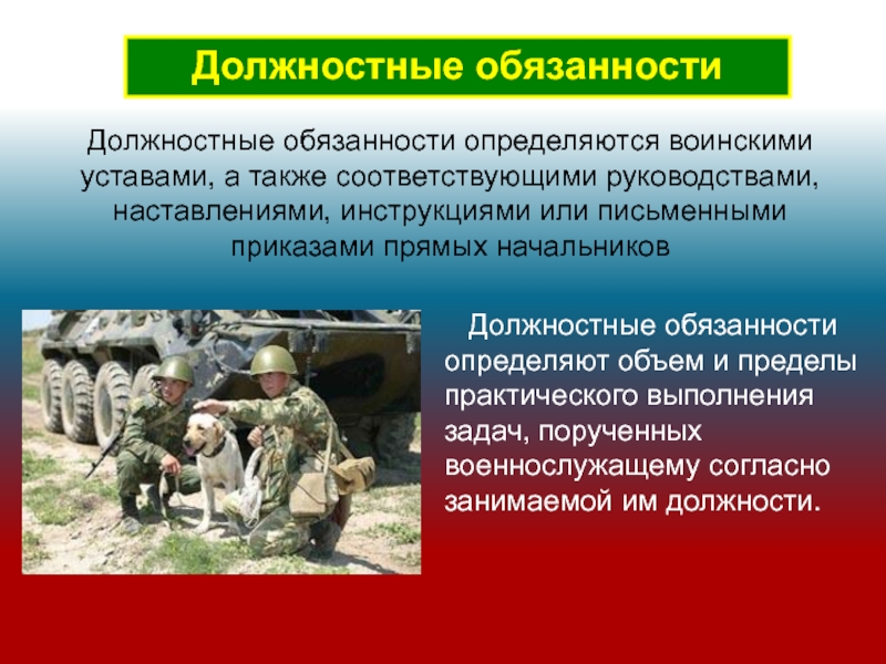 Должностные обязанности определяют объем и пределы практического выполнения задач, порученных военнослужащему согласно занимаемой им должности.