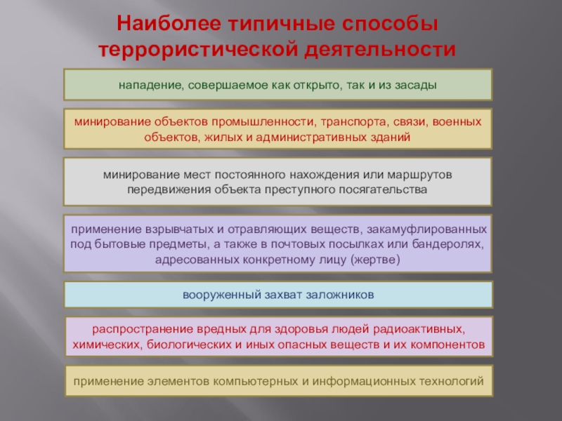 применение взрывчатых и отравляющих веществ, закамуфлированных под бытовые предметы, а также в почтовых посылках или бандеролях, адресованных конкретному лицу (жертве)